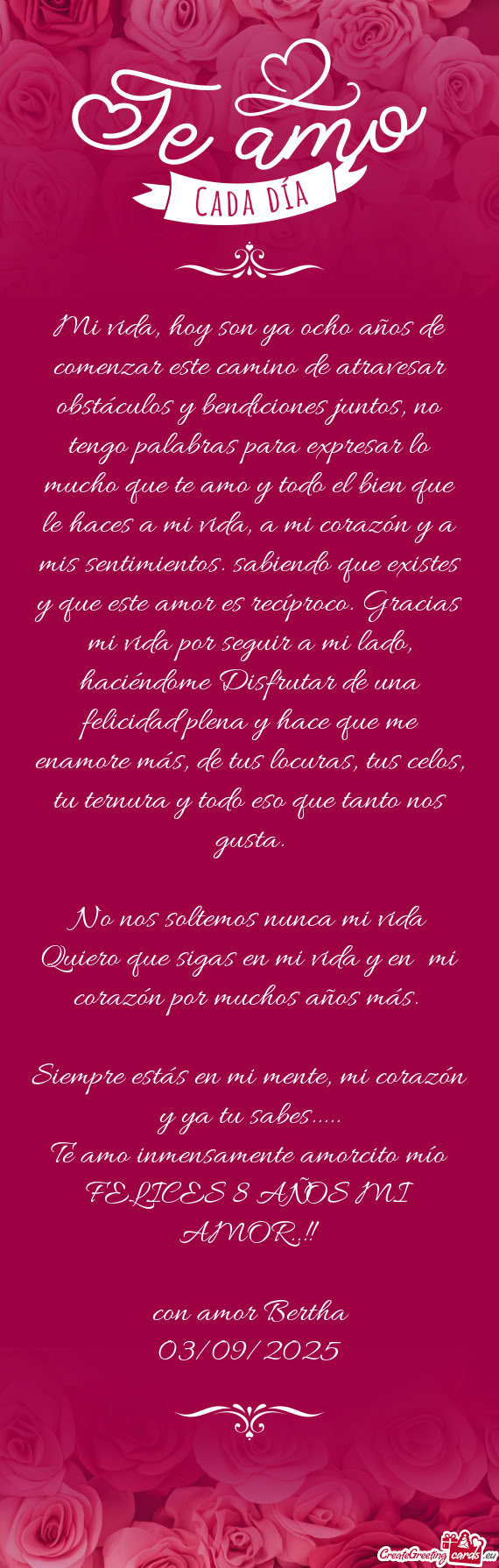 Un amor puro como el nuestro no morirá jamás porque este sentimiento es mucho más fuerte que una roca y puede superar toda adversidad que se presente en el camino. Eres el amor de mi vida y la razón de cada uno de mis días. Te amo muchísimo.