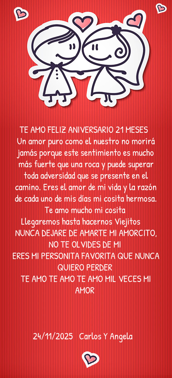 Un mes más de alegrías a tu lado, de muchas emociones juntas encontradas, de días difíciles y de días felices, pero si de algo estoy seguro es de que quiero seguir caminando de tu mano. Aunque no compartamos muchos momentos juntos, recuerda que siempre estás en mi mente y mi corazón.