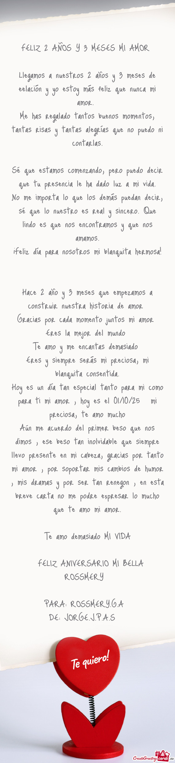 Feliz Aniversario mi niño hermoso,mi amor jsjs ,otro mes más a tu lado y con la persona q amo , pasar tdo este tiempo a tu lado es una de las cosas más valiosas q me pudo Aver pasado así como la primera vez q hablamos jsjs ,eres muy especial e importante para mí no lo olvides mi vida, te amo muchooo :3