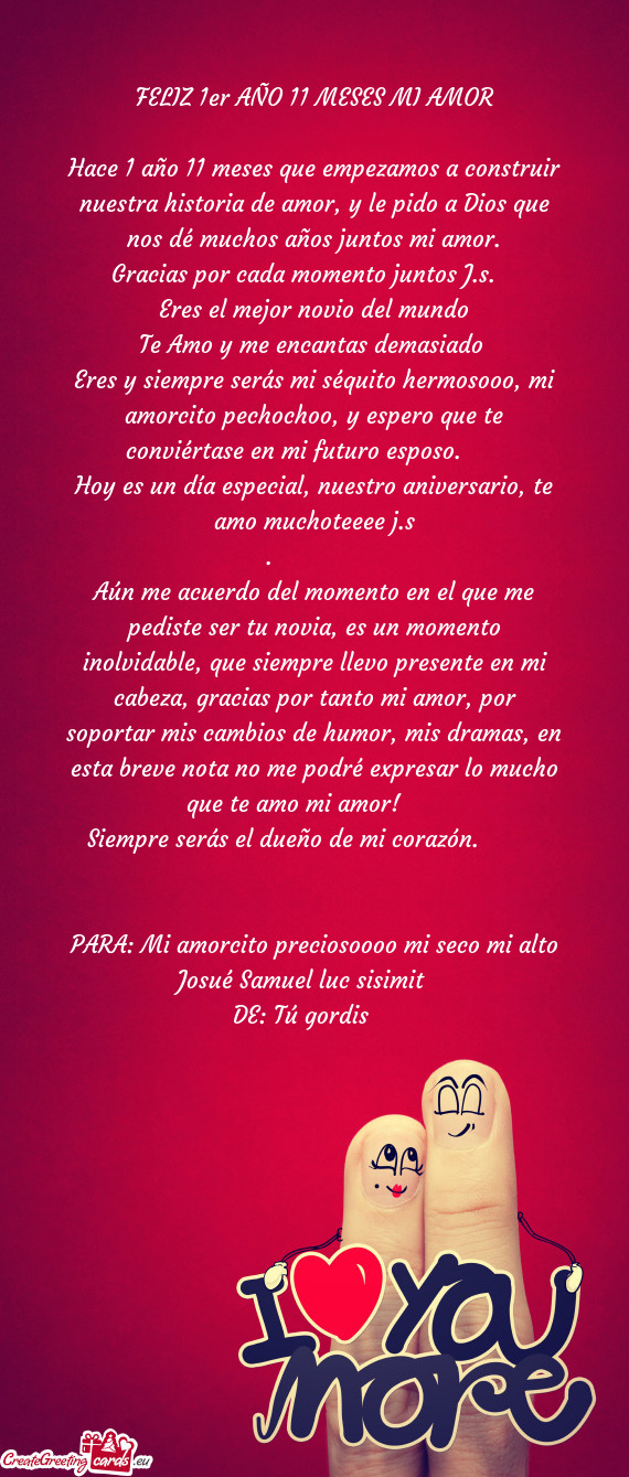 Hace un mes que nuestra relación empezó, y aunque no ha sido como usted merece y tal vez como esperaba, siento que han sido hermosos todos nuestros MOMENTOS compartidos. Realmente me ha hecho sentir el hombre más feliz y afortunado del mundo. Cada mal día siempre ha estado ahí para sacarme una sonrisa y eso es lo que más le agradezco MI REINA. Le pido a Dios todo siga saliendo muy bien como hasta ahora y que nos permita seguir juntos por muchos meses y años más Amor!
