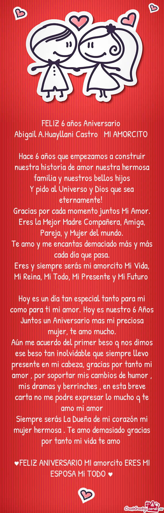 Espero que este sea solo el primero de muchos aniversarios, y que sigamos construyendo recuerdos y superando desafíos siempre de la mano. Te amo más de lo que puedo expresar con palabras. Eres mi todo, mi razón de sonreír y la persona con la que quiero compartir todos los días de mi vida.