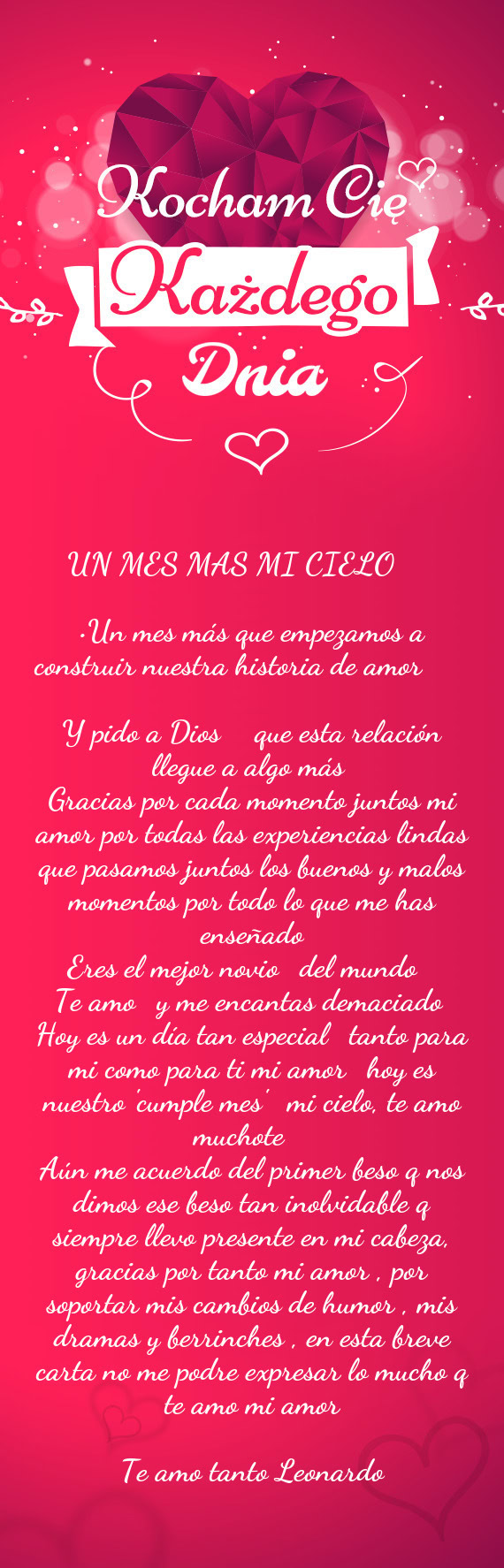 Un mes más de alegrías a tu lado, de muchas emociones juntas encontradas, de días difíciles y de días felices, pero si de algo estoy seguro es de que quiero seguir caminando de tu mano y cumplir todo lo que nos prometimos.